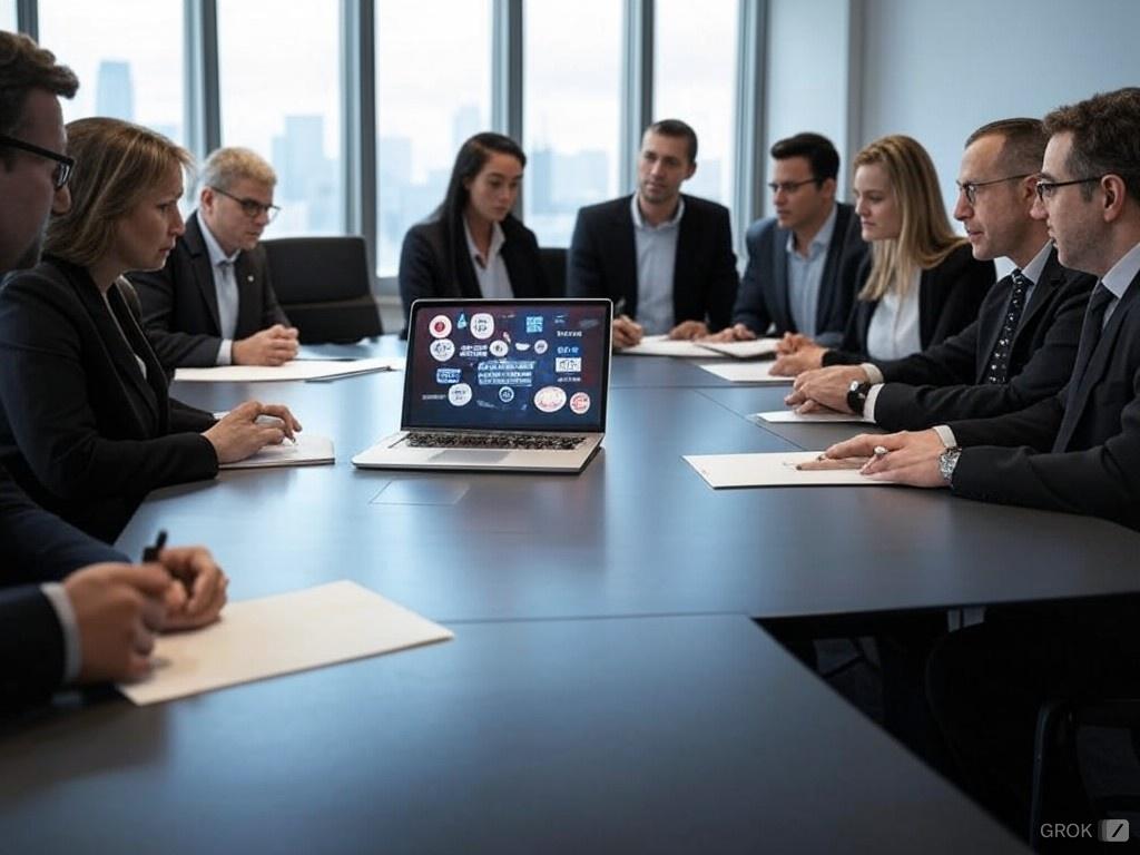 A group of business professionals sitting around a conference table, engaged in a lively discussion. One person is using a laptop to showcase social media marketing strategies, while others are taking notes and discussing ideas. The room is bright and modern, with a large window showing a view of the city skyline. The atmosphere is dynamic and collaborative, reflecting